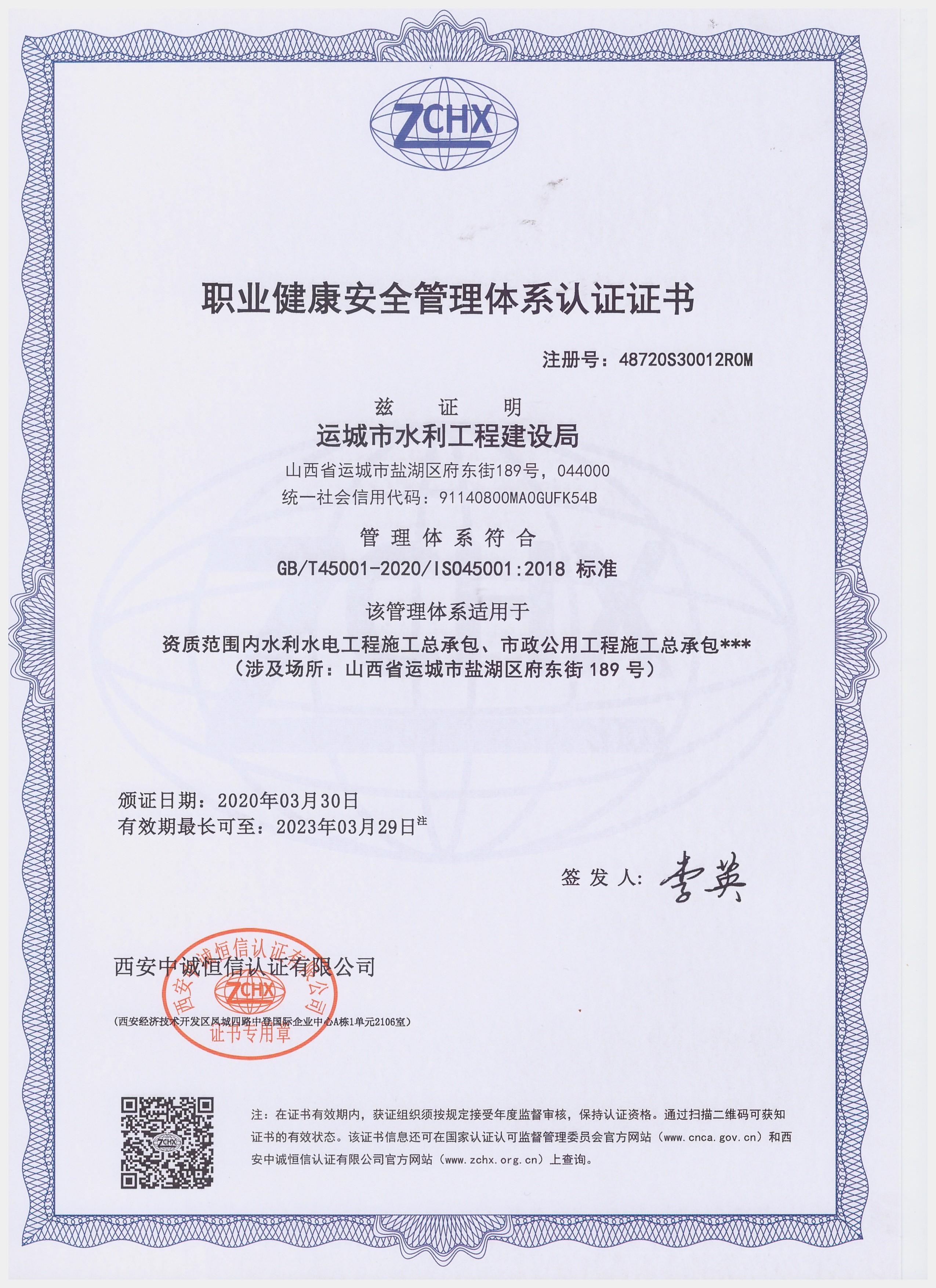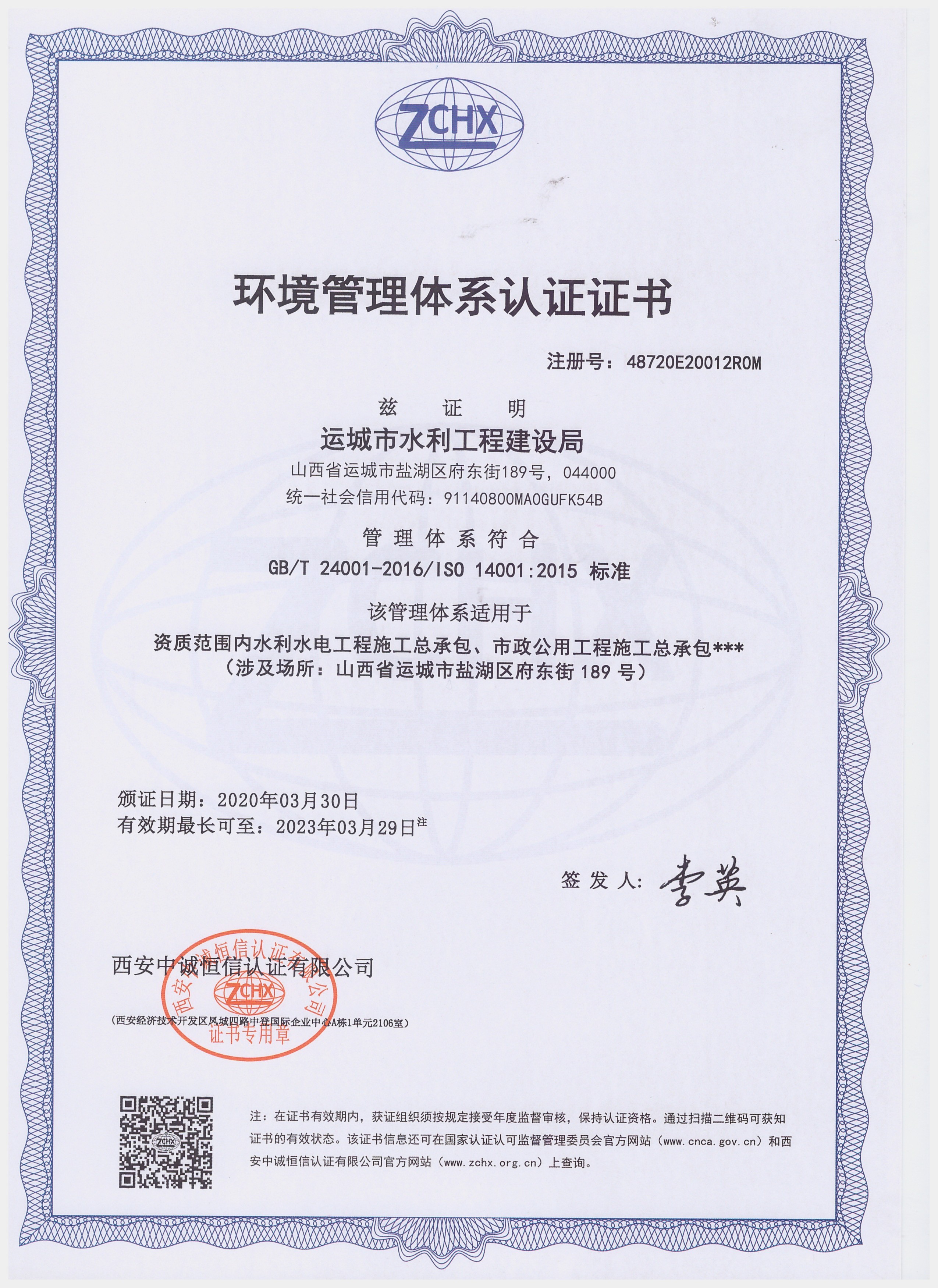 经西安中诚恒信认证有限公司的评估和审核,2020年3月30日,我局获得了环境管理体系认证和职业健康安全管理体系认证。