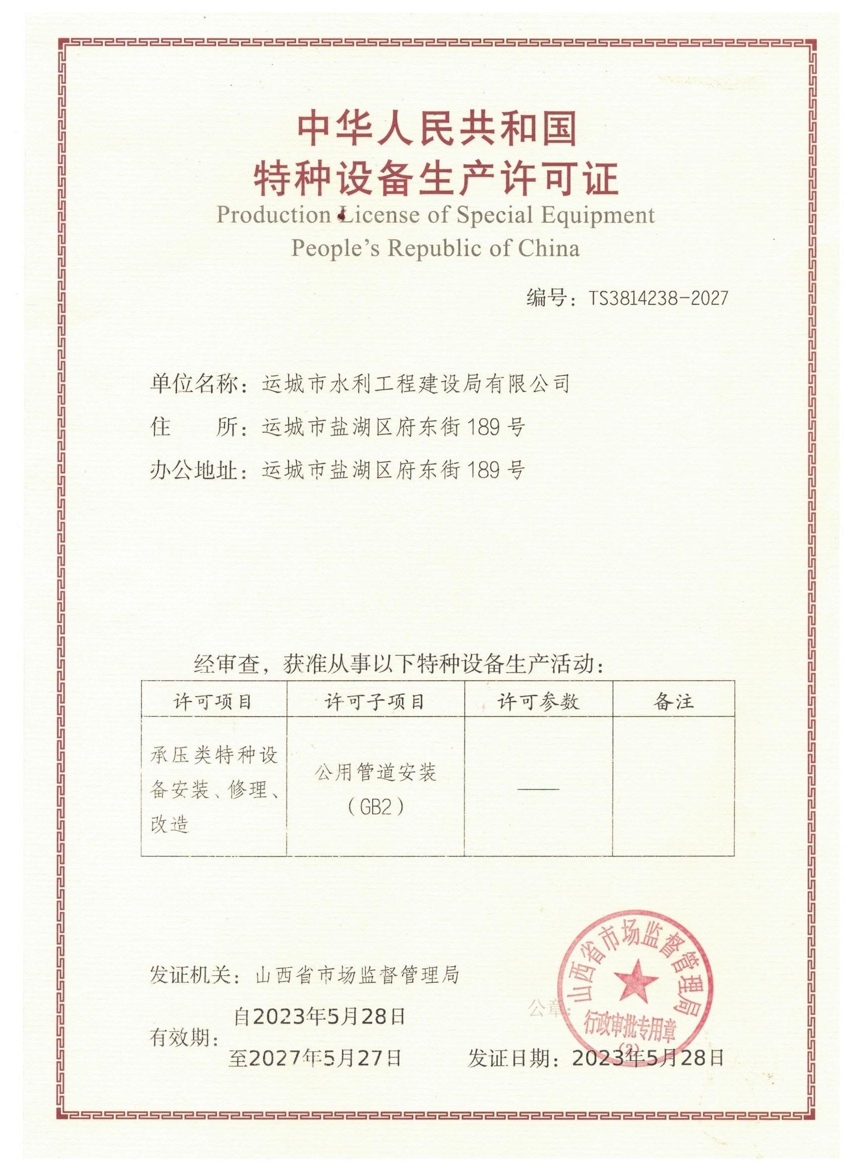 近日,经山西省市场监督管理局审批,太原市质量检验协会评审组现场取证鉴定评审,山西省市场监督管理局核准发布,我公司新添中华人民共和国特种设备生产许可证——压力管道GB2资质。